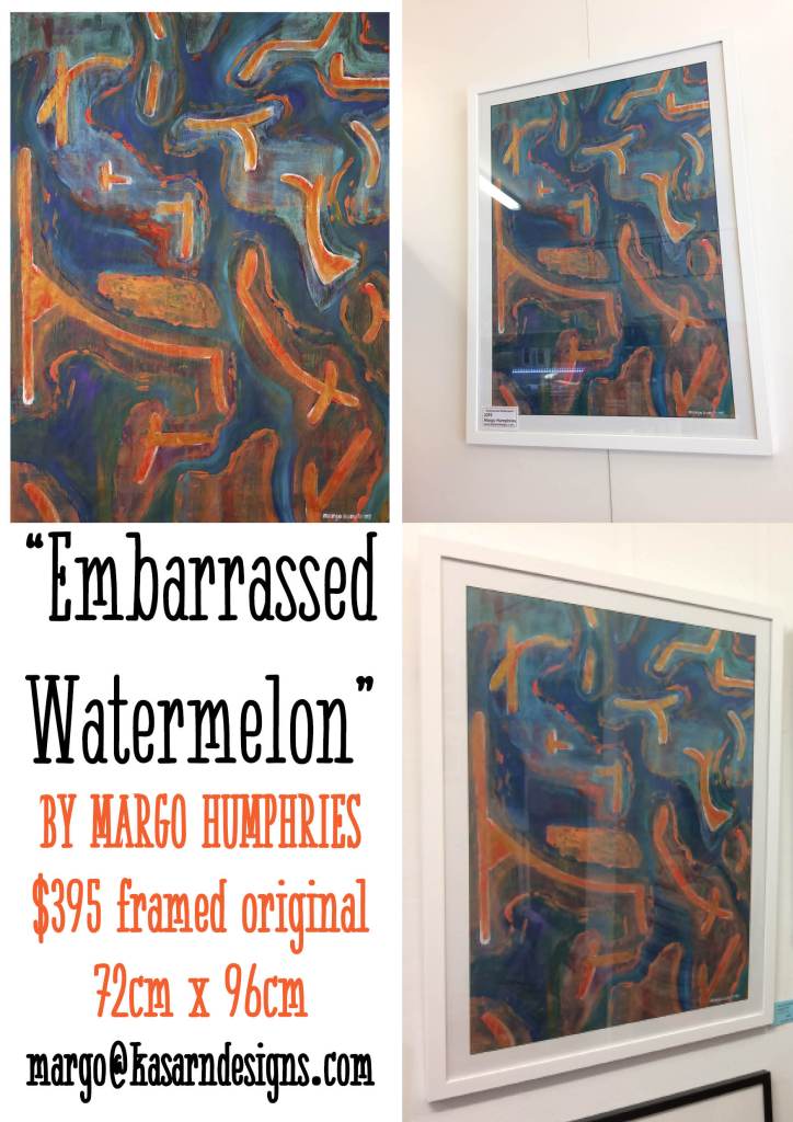 “Embarrassed Watermelon” by Margo Humphries $395 framed original 72cm x 96cm margo@kasarndesigns.com