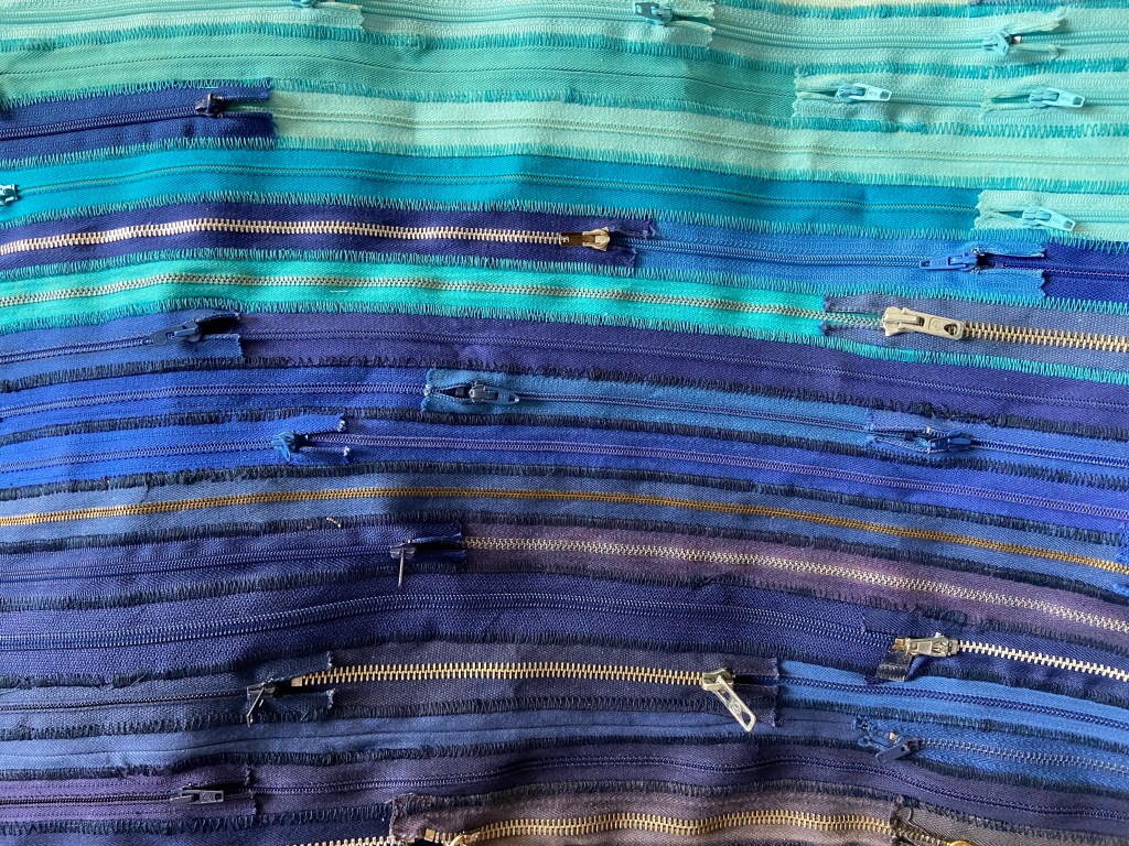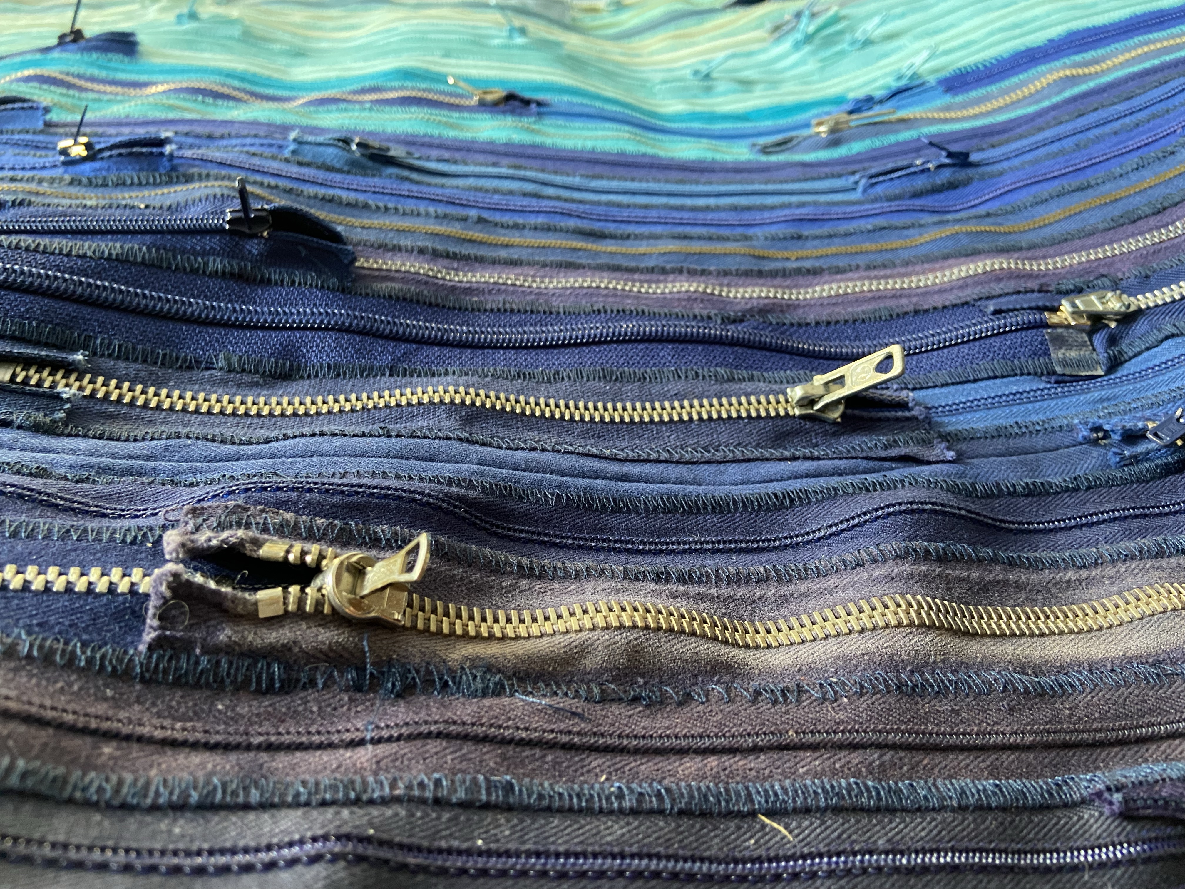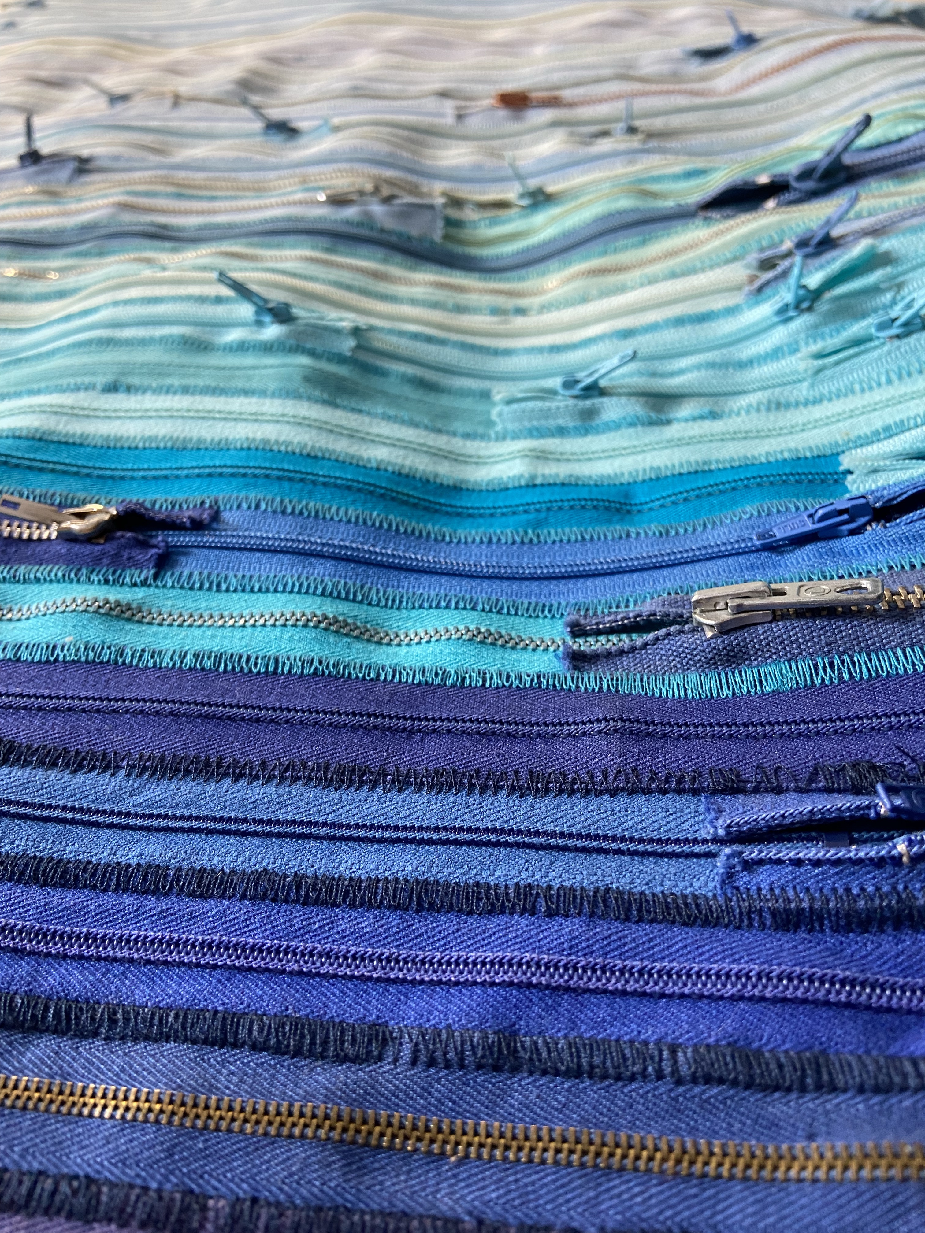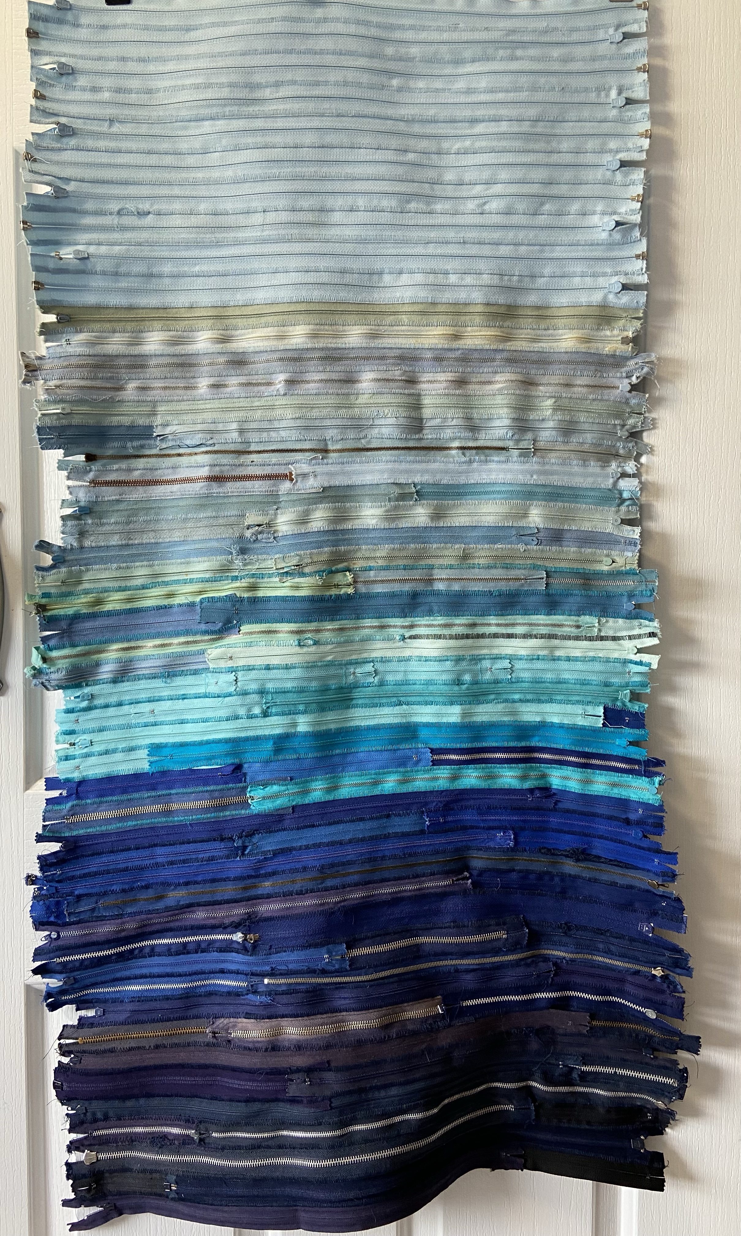 My upcycled blue zips is complete! Just the wall hanging system to do next