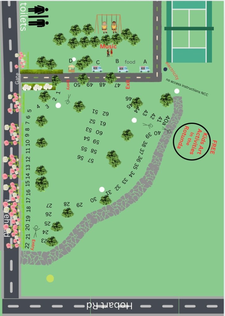 Art Bazaar is on tomorrow, Sunday 1 December at Lambton Park – I will be at stall #21 – refer to site map below