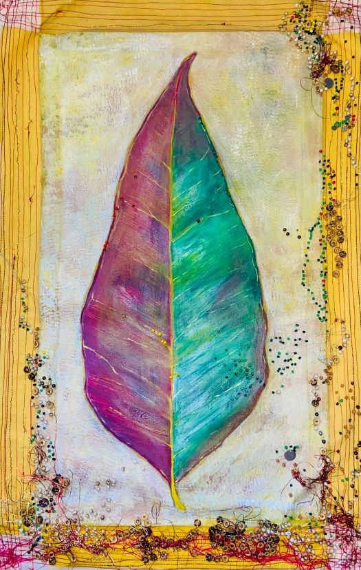 I’ve just finished this new artwork, “Gumleaf textile”, mixed media (painting and sewing) framed $250.00. Enquiries margo@kasarndesigns.com