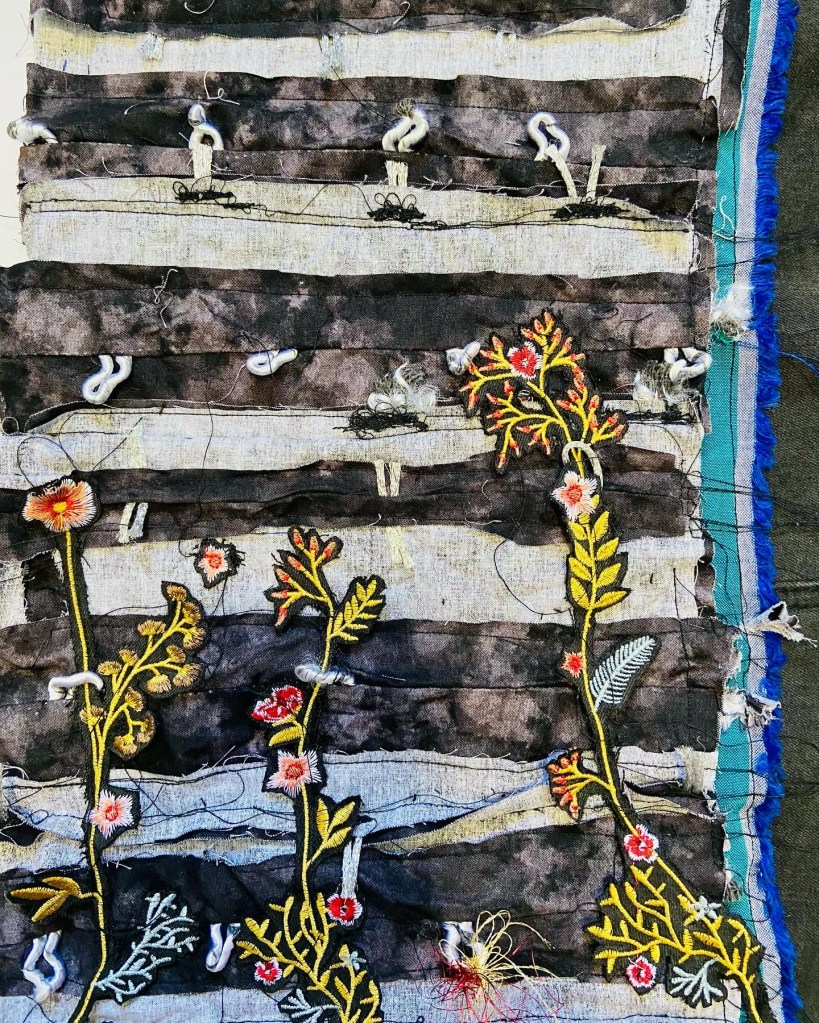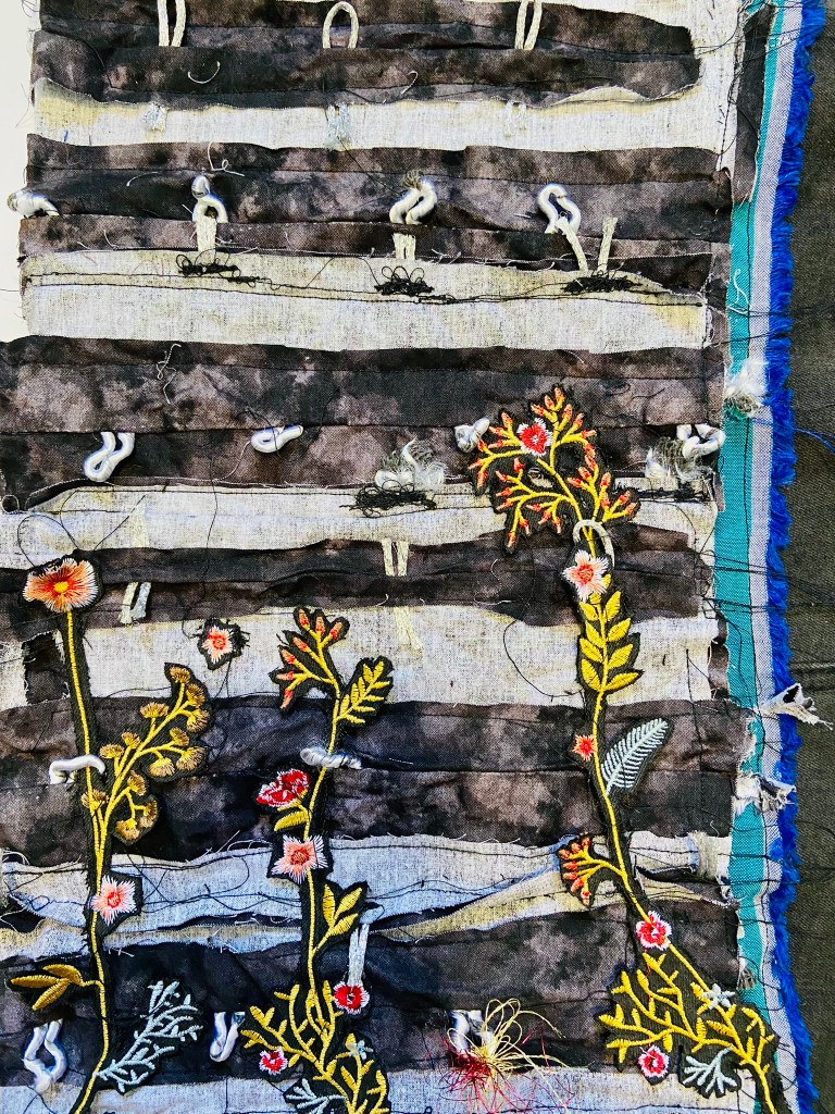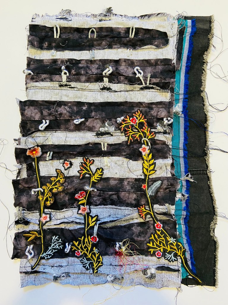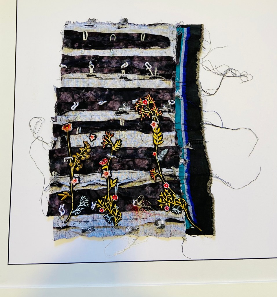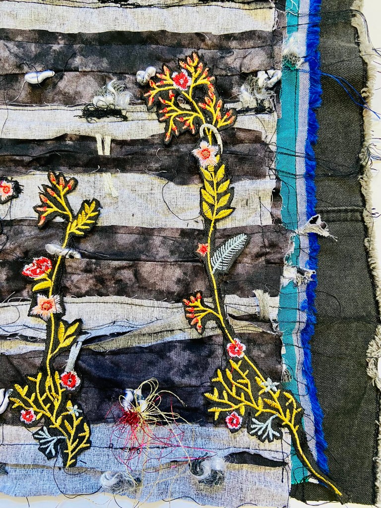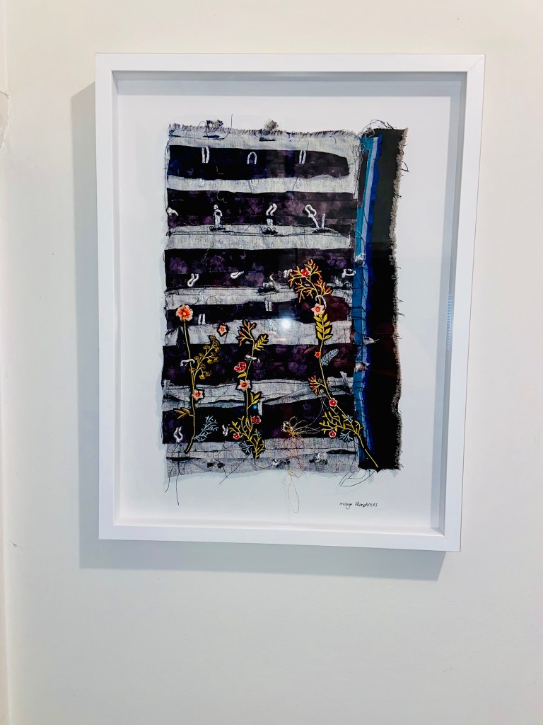This is my latest artwork which I’ve had framed! “Flowers and Threads”. This work is 100% textile. It is framed and ready to hang with a deep box shadow frame