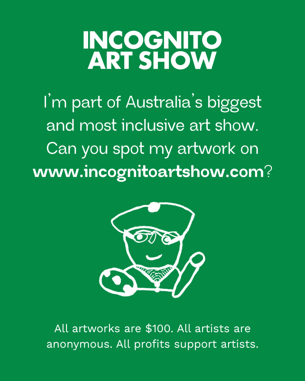 Add your favourites to your wishlist before the show for when the sale goes live. All artworks are $100. All profits support artists.