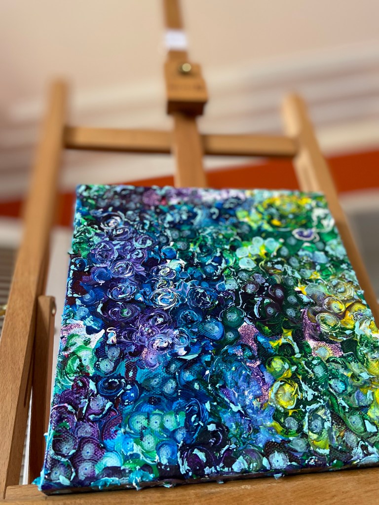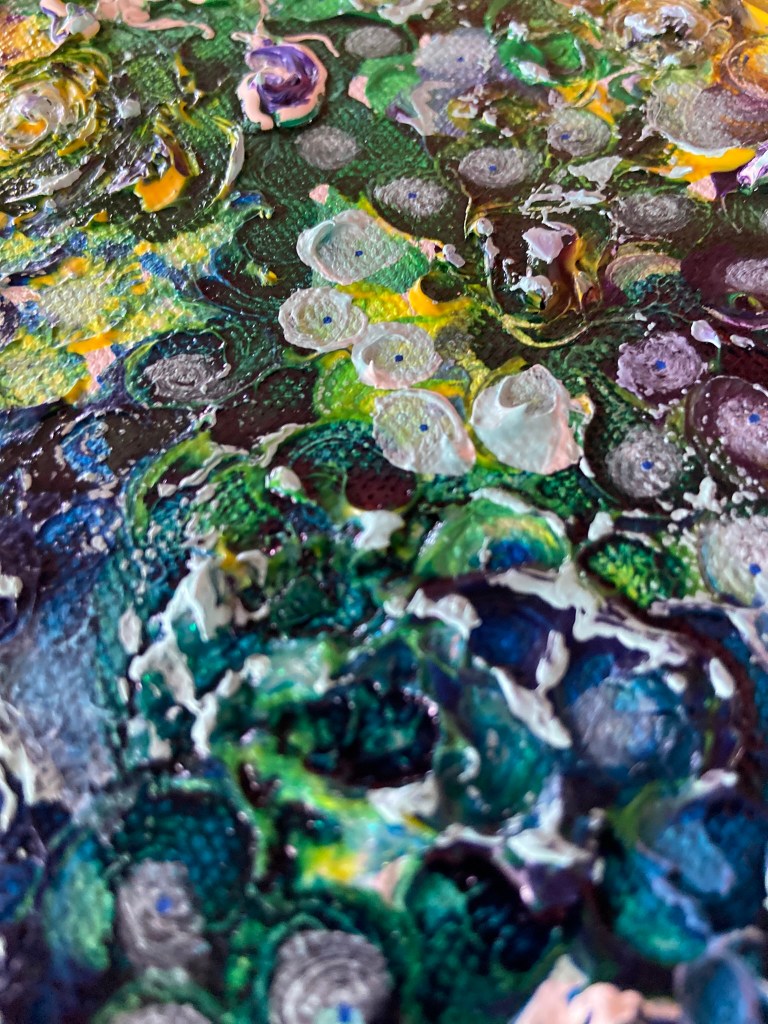 Painting description – Just like a lot of the visual work I create and design this piece has become a pattern. The pattern in this piece is based on a group of sequins of different colours. These not only look sparkly but when light is angled or flashed at sequins they change the colour of light you see. This unmistakable 3D dazzle is also represented by thicker paint sticking up on some areas on the canvas.